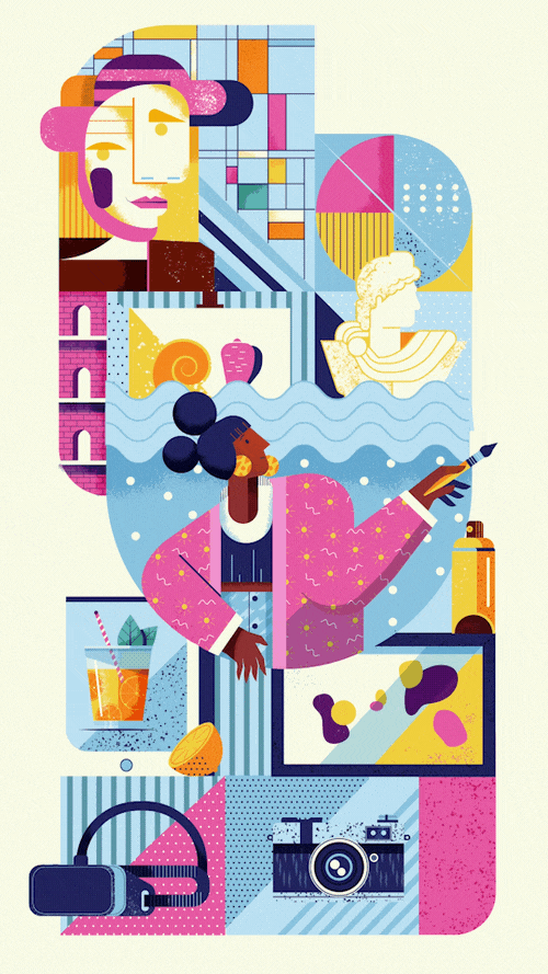 Animation d'illustrations pour promouvoir le blog d'Adobe Createfulness, campagne de l'été 2019. Outils de communication pour les réseaux sociaux, sur le thème de la créativité.